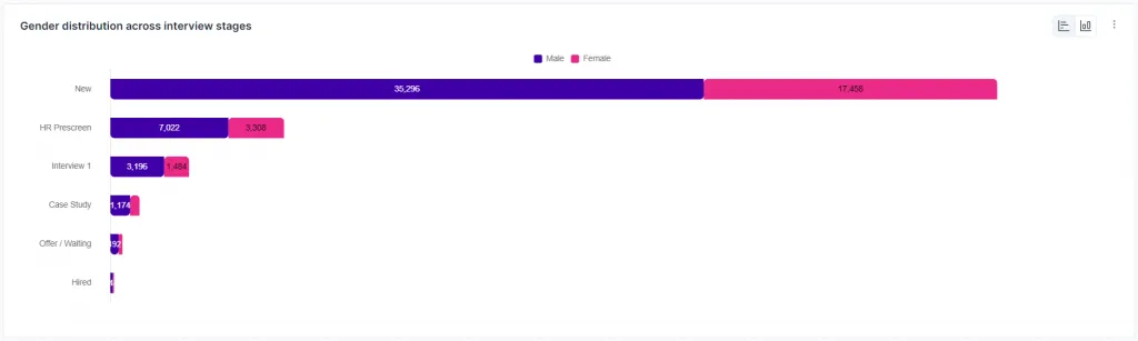Gender distribution in the recruiting process: Applicants' genders at various stages of the application process. This monitoring helps to identify potential gender-specific biases or bottlenecks and promotes fairer personnel selection.