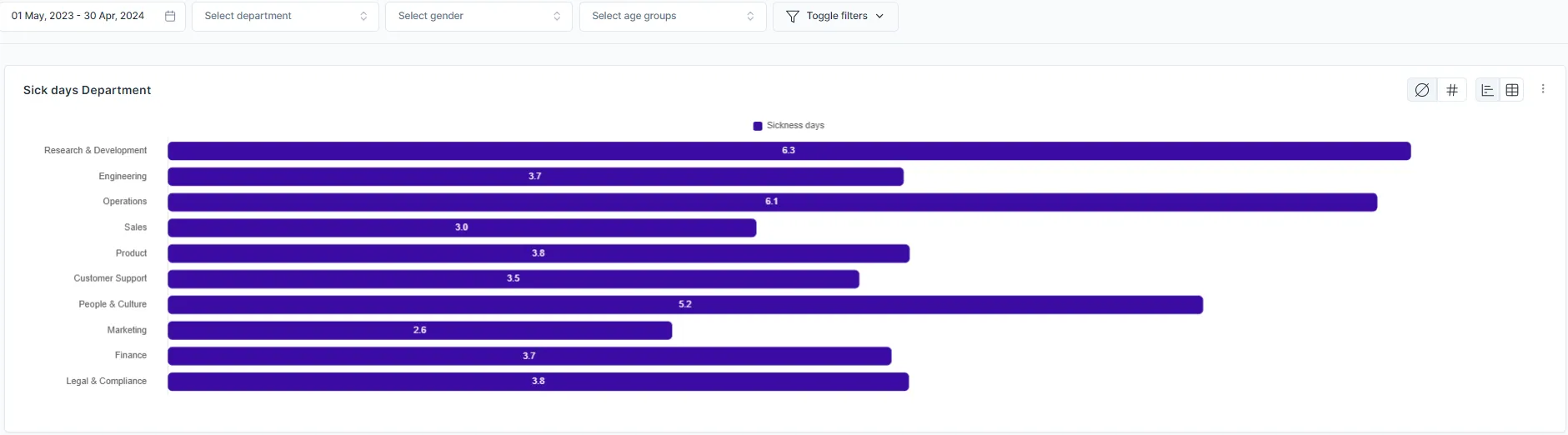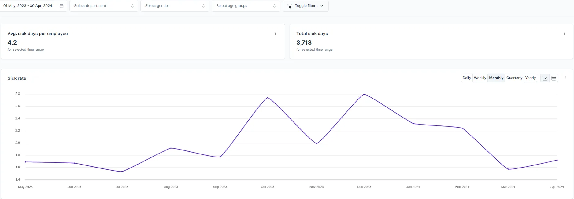 Illness rate: The sickness rate is calculated as the total number of sick days in full-time equivalents (FTE) divided by the total number of working days (FTE) to determine the proportion of sick days in total working days. This key figure provides insights into the health and well-being of the workforce by showing what percentage of working time is lost due to illness.