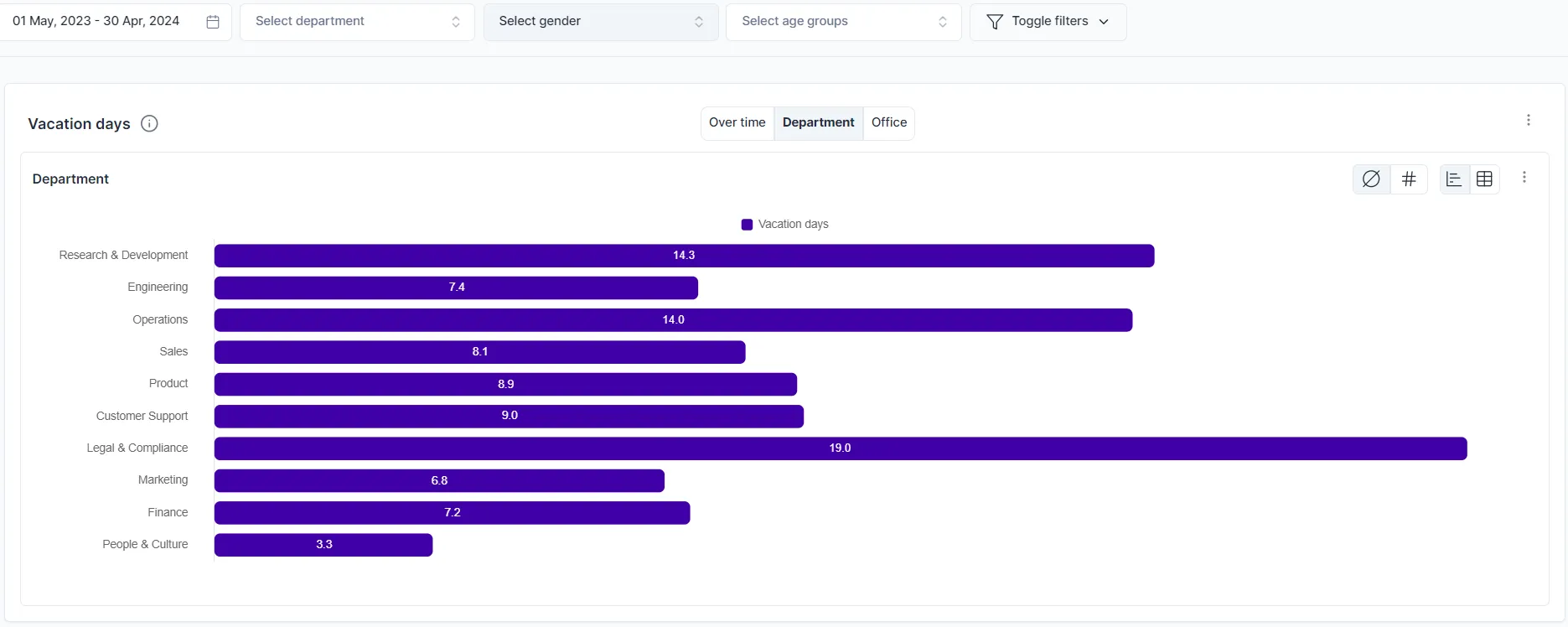 Vacation days: Total number of vacation days taken, paid or unpaid, over a specific period of time. Monitoring helps manage workforce availability and plan peak hours to maintain operational effectiveness.