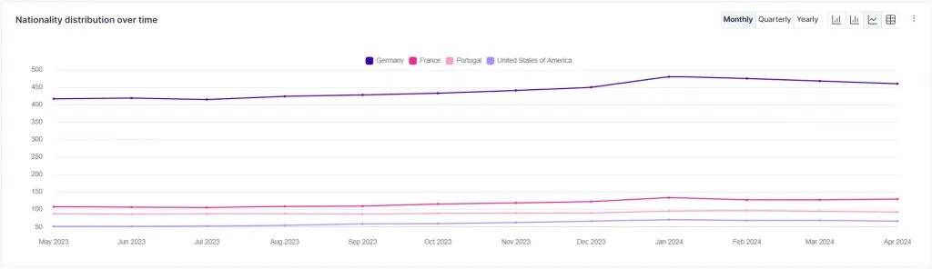 Nationality distribution: Composition of employees by nationality and how they changed over time. Monitoring helps to understand diversity levels and develop strategies for a more inclusive work environment.