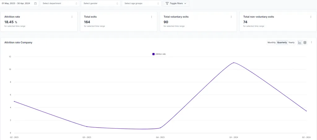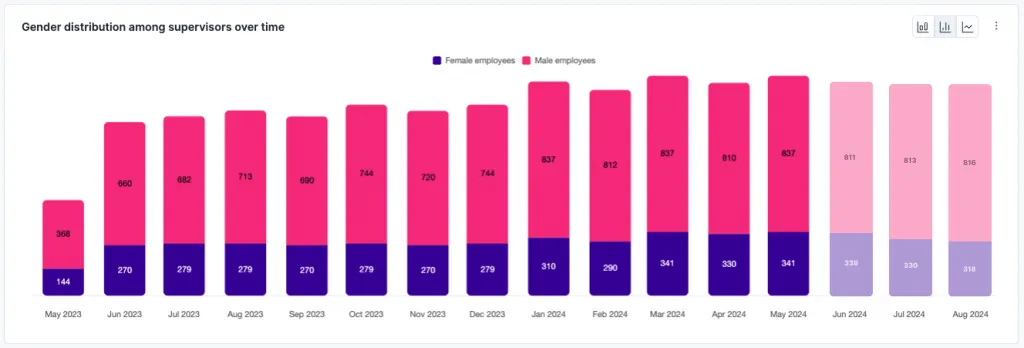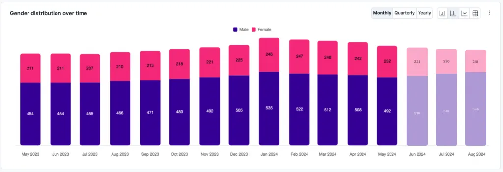 Gender distribution: Distribution and gender changes within the workforce over a period of time. Provides insights into trends in gender diversity, equality initiatives, and areas where gender imbalances exist.