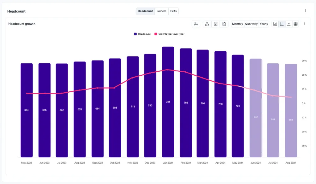 Number of employees & growth: The number of employees is the total number of active employees in an organization at a specific point in time, in this case monthly. It provides an overview of the size of the workforce and is typically used for reporting, personnel planning and organizational analyses.