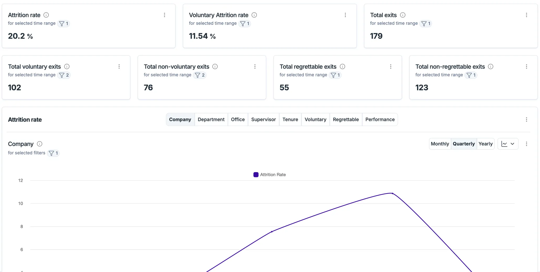 Die Bindungs- bzw. Fluktuationssrate ist die zentrale Kennzahl. Sie zeigt, welcher Anteil der Mitarbeitenden bleibt – und wie viele das Unternehmen verlassen. Wichtig ist, diese Rate zu segmentieren (z. B. nach Bereich, Rolle oder Tenure), um Muster und mögliche Hotspots frühzeitig sichtbar zu machen.