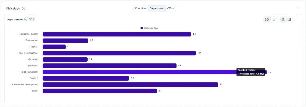 Das Tracking von Krankheitstagen über Abteilungen hinweg liefert Einblicke in Fehlzeiten-Trends und das Wohlbefinden der Mitarbeitenden. Maria nutzt diese Daten, um Krankheitsentwicklungen mit mentalen Gesundheitsinitiativen zu verknüpfen, sodass das Wohlbefinden der Mitarbeitenden priorisiert wird und Fehlzeiten reduziert werden.