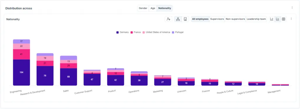 Maria legt großen Wert auf Diversität in allen Abteilungen und überwacht die Verteilung von Geschlechtern und Nationalitäten. Dieser Ansatz hilft dabei, potenzielle Biases zu identifizieren und sicherzustellen, dass die Organisation ihre Diversity-Ziele erreicht – und letztlich eine inklusive Unternehmenskultur fördert.