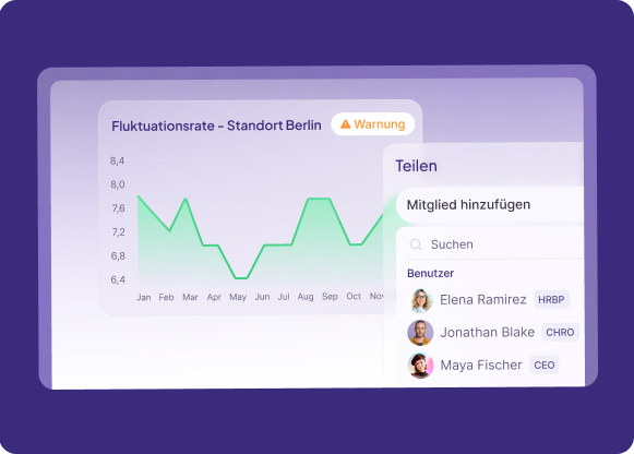 Unsere KI zeigt dir Mitarbeiterbindungsstrends – team-, standort- oder rollenspezifisch. So kannst du frühzeitig reagieren.